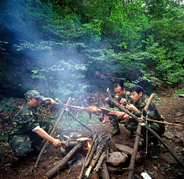 ????2006年9月16日,航天員費俊龍(中)在遼寧進行叢林野外生存訓練。新華社發(朱九通 攝)