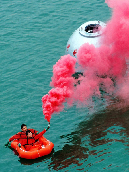 ????2005年10月17日,神舟六號返回艙在內蒙古四子王旗中部草原成功著陸,首先出艙的航天員費俊龍看著聶海勝出艙。新華社記者 王建民 攝