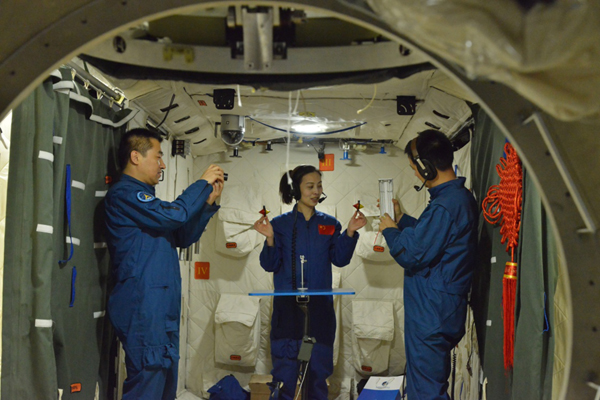 ????2013年5月22日,航天員王亞平(中)、聶海勝(右)、張曉光在模擬天宮一號組合體內進行太空授課訓練。新華社發(朱九通 攝)