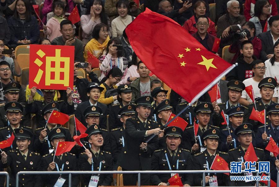 10月22日,觀眾在看臺為中國隊加油助威。 當日,在武漢進行的第七屆世界軍人運動會女子排球決賽中,中國隊以1比3不敵巴西隊,獲得亞軍。 新華社記者賀長山攝