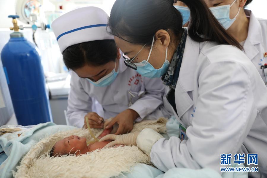 在新生兒病房,空軍特色醫(yī)學中心援藏醫(yī)療隊隊員(右)帶教左貢縣人民醫(yī)院醫(yī)護人員(左)實施靜脈穿刺(7月17日攝)。新華社發(fā)(張洪濤 攝)