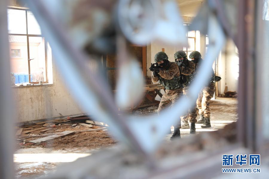 武警第一機動總隊某支隊特戰隊員在進行房間搜索訓練(12月15日攝)。新華社發(常龍 攝)