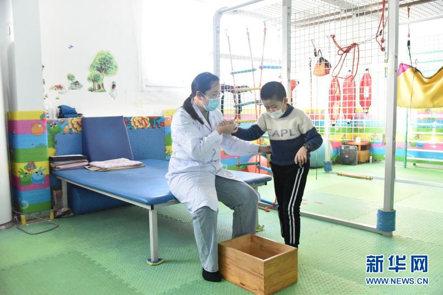 在哈爾濱博能中醫(yī)門(mén)診部,劉雨晴為腦癱兒童進(jìn)行康復(fù)訓(xùn)練(2月2日攝)。