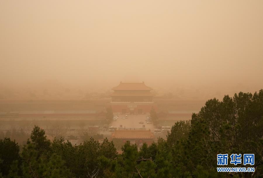 這是3月15日在景山上拍攝的北京故宮。當日,我國北方多地出現沙塵天氣。新華社記者 陳曄華 攝