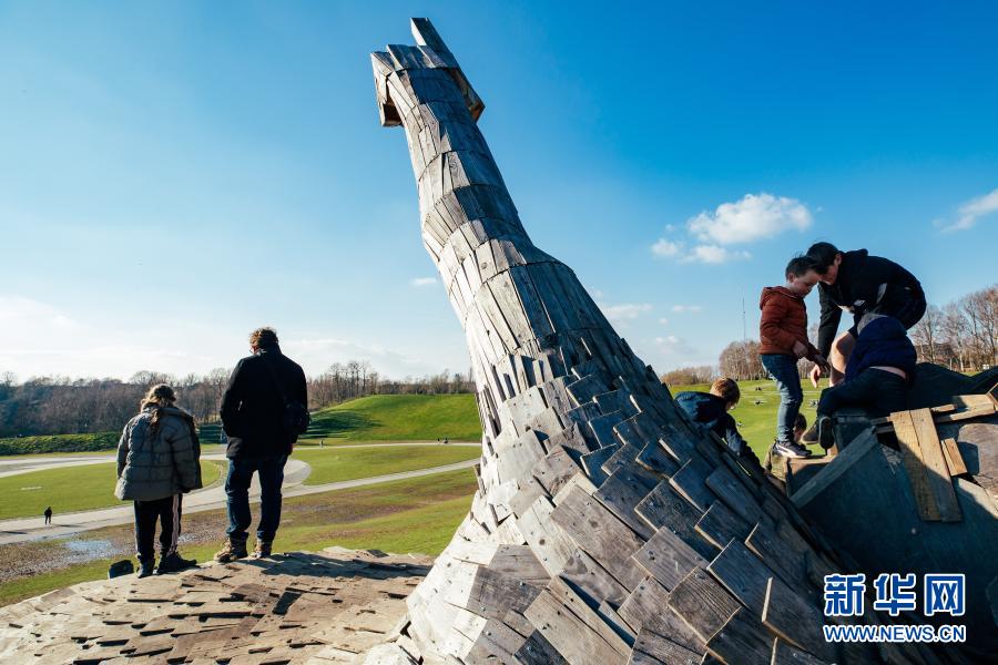 3月20日,人們在比利時博姆市的德舒爾森林公園和一座“巨人”雕塑“玩?!薄P氯A社記者 張鋮 攝
