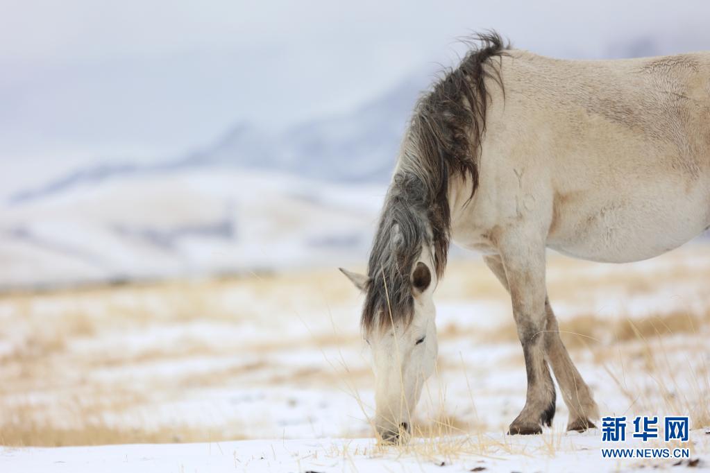 當日,受冷空氣影響,位于甘肅省河西走廊中部、祁連山北麓的山丹馬場降雪,馬群在雪原上奔跑覓食,構成了一幅壯美高原雪景 。