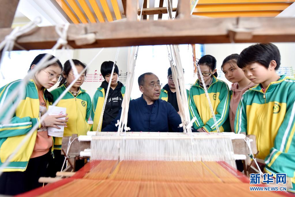 4月7日,威縣土布紡織技藝傳承人高慶海在威縣第四小學向學生講解老粗布紡織技藝。近年來,河北省邢臺市威縣積極開展“非遺傳承進校園”活動,將當地特色非遺項目引入學校課堂,讓學生近距離感受民間傳統技藝的魅力,促進非遺文化的保護和傳承。新華社記者 朱旭東 攝