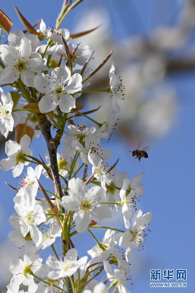 4月11日,在鐵門關市一處梨園,蜜蜂在授粉。新華社記者 丁磊 攝