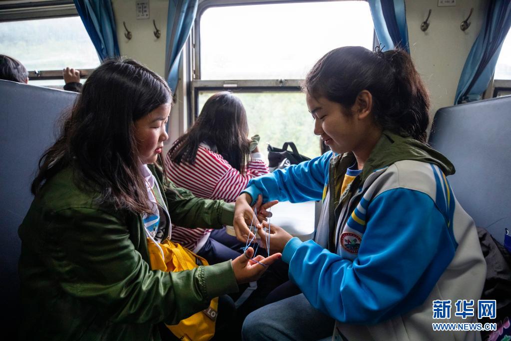 在乘坐5633次列車從家返校途中,兩名女生在玩翻繩(4月11日攝)。新華社記者 沈伯韓 攝