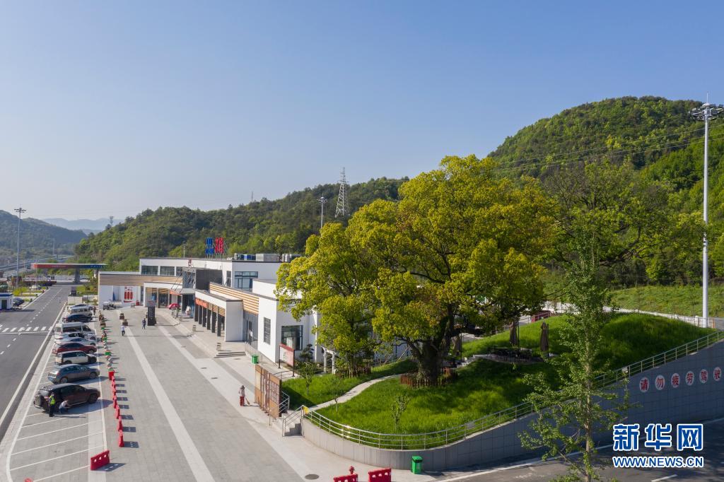 杭州第二繞城高速西復線次塢服務區有3棵樹齡在100年以上的古樹。服務區在建設過程中,將古樹保護起來,現已成為一道特色景觀。新華社發(郭斌 攝)
