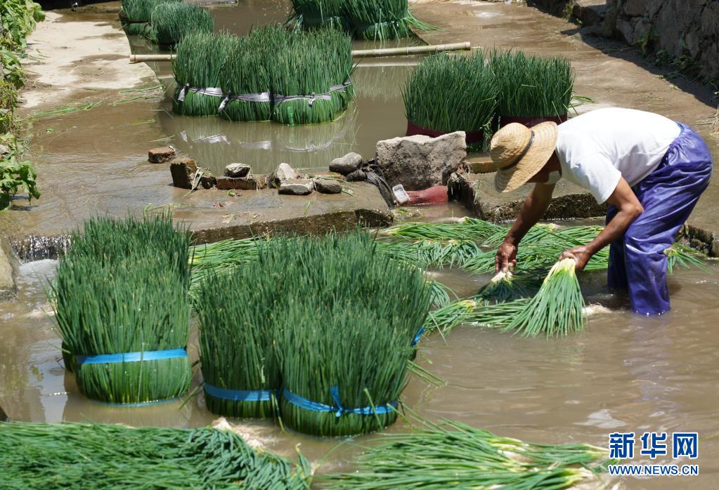 4月20日,浙江省樂清市雁蕩鎮的香蔥種植專業合作社社員在清洗剛采摘的香蔥。