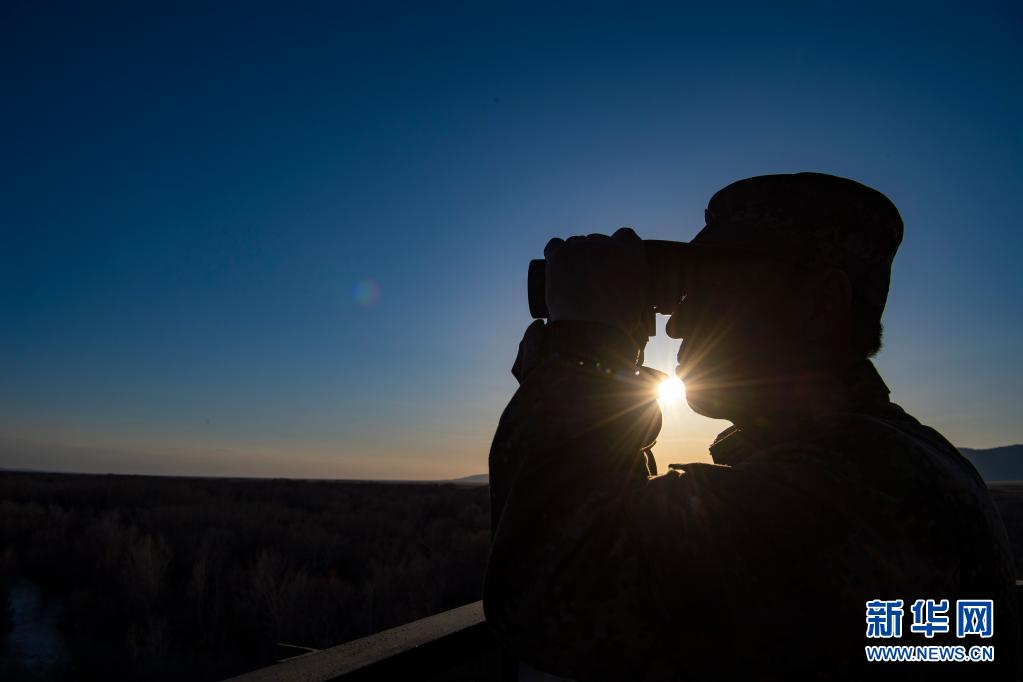新疆生產建設兵團第10師185團職工馬軍武在瞭望塔上觀察管護轄區(4月9日攝)。