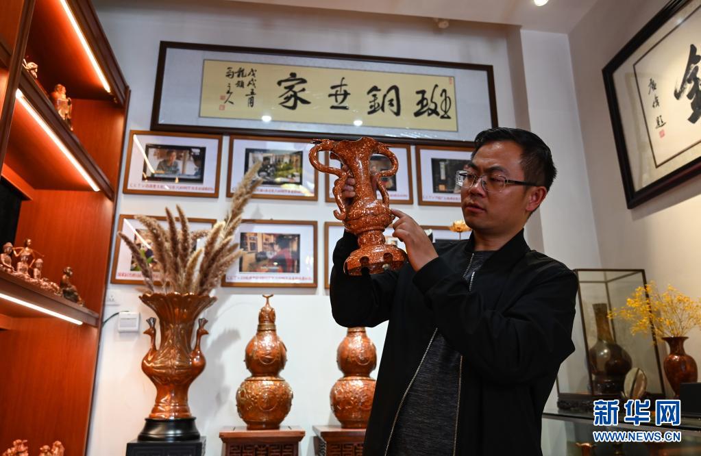 地處滇東北、烏蒙山腹地的云南會澤縣流傳著具有300多年歷史的斑銅制作工藝。斑銅工藝復雜,要采用高品位的銅為原料,經過20余道工序制作而成。產品“妙在有斑,貴在渾厚”,風格獨樹一幟。33歲的張偉是會澤“張氏斑銅”的第十三代傳人。自幼深受地域文化和家庭熏陶的他,大學畢業后,返鄉從事斑銅制作工作。在會澤古城的“銅匠街”,張偉創辦了斑銅傳習館,不斷研發斑銅新產品、傳承著這項非遺技藝。“斑銅是一種情感、一種文化,希望在我們這代人的努力下能夠更好地將它傳承下去,讓更多人了解斑銅的獨特魅力。”張偉說。