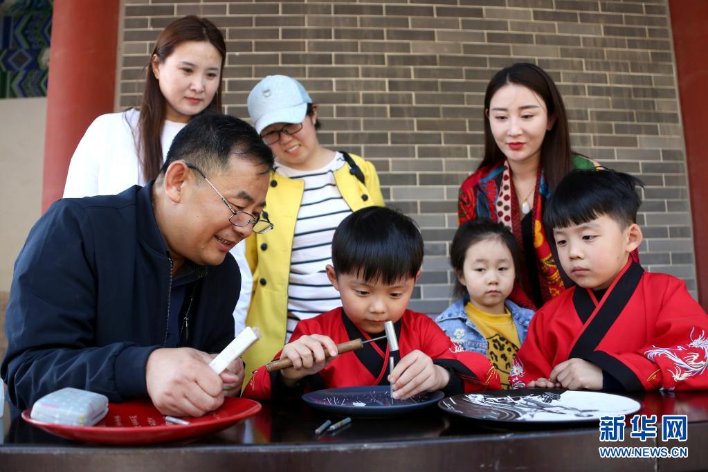 5月1日,在山東省棗莊市孟莊鎮境內的龜山風景區,民間藝人胡安同(前左一)向小朋友傳授非遺刻瓷技藝。