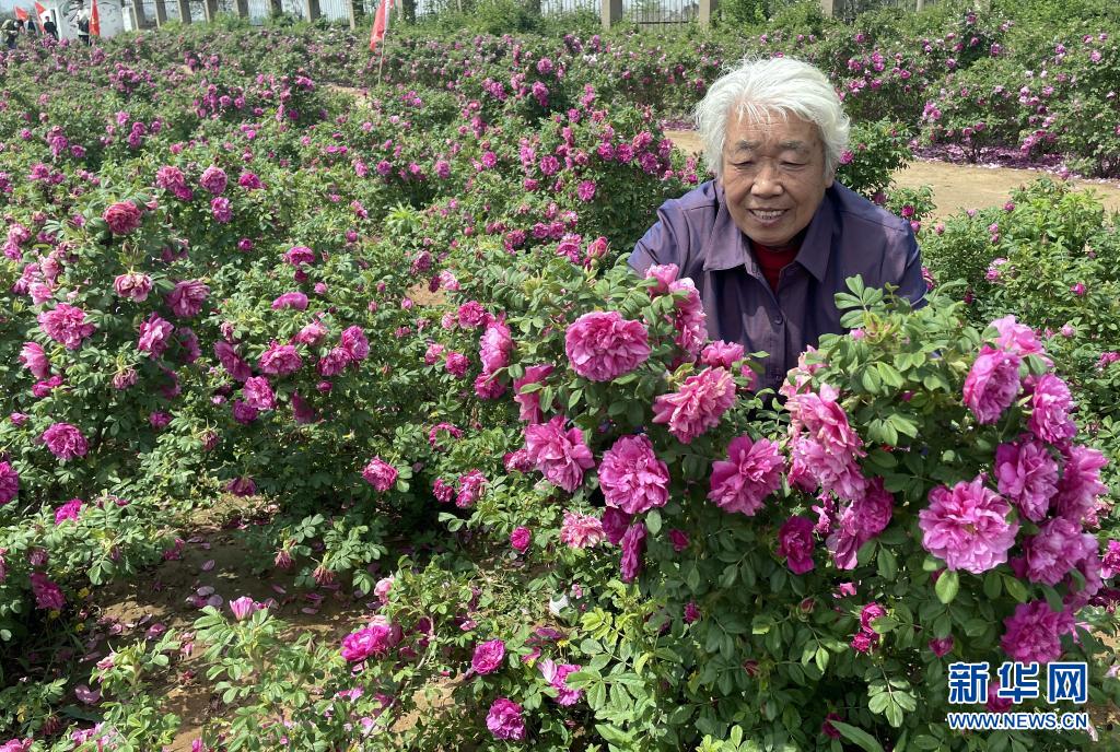 5月4日,一名老人在平陰縣玫瑰園內欣賞玫瑰。