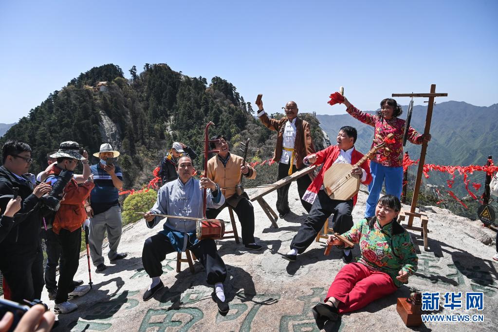 5月5日,華山景區(qū)西峰索道“華陰老腔團(tuán)”在華山西峰之巔為游客表演。