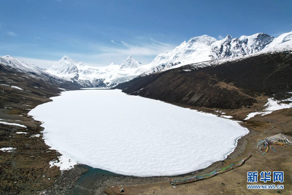 這是5月4日拍攝的薩普雪山和雪山腳下的冰湖(無人機照片)。