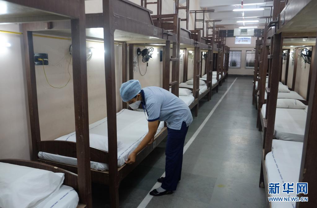5月6日,工作人員在印度加爾各答一處被改造成新冠隔離中心的足球場內整理床鋪。