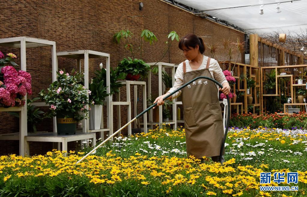 5月7日,在秦嶺花世界現代農業園區,一名園藝工人在澆花。