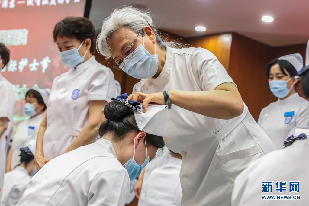 5月10日,北京大學(xué)人民醫(yī)院的護(hù)理屆前輩閆鳳玲(中)為新入職護(hù)士授帽。