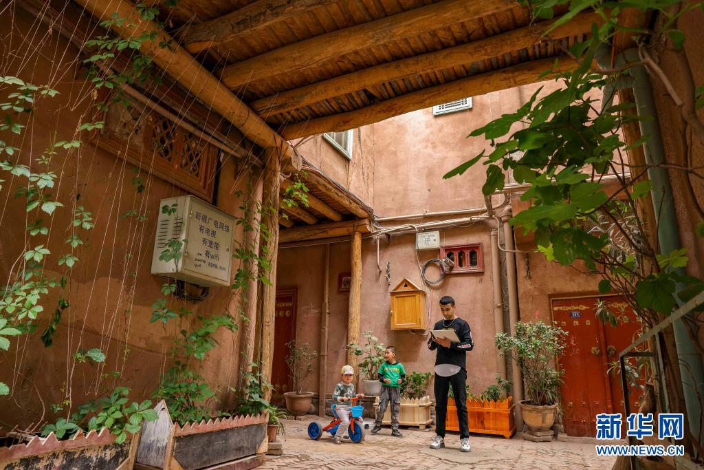 麥麥提吐爾遜江·麥麥提依明在新疆喀什古城景區的小巷內進行速寫創作,兩名小朋友好奇上前圍觀(5月6日攝)。新華社記者 胡虎虎 攝