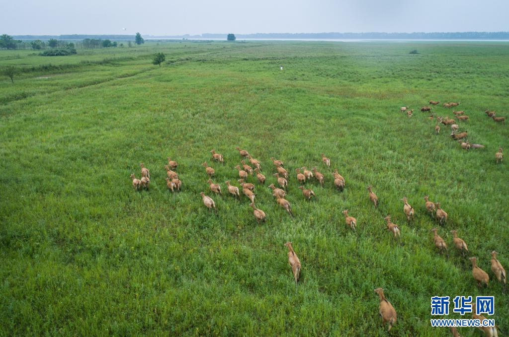5月17日,一群麋鹿在石首麋鹿國家級自然保護區內活動(無人機照片)。新華社記者 肖藝九 攝