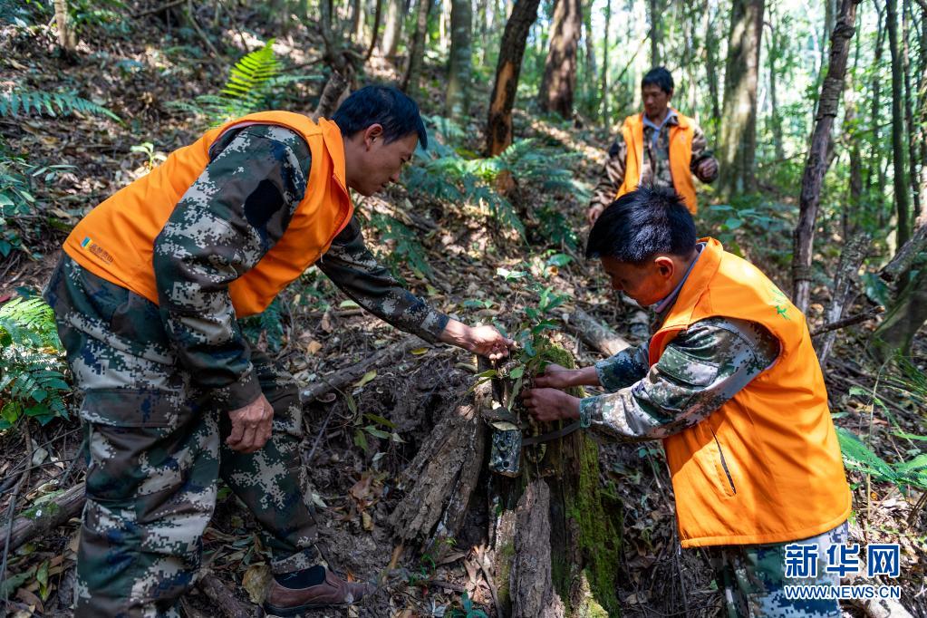 護林員楊有山(右一)和同事在布設紅外相機(3月15日攝)。