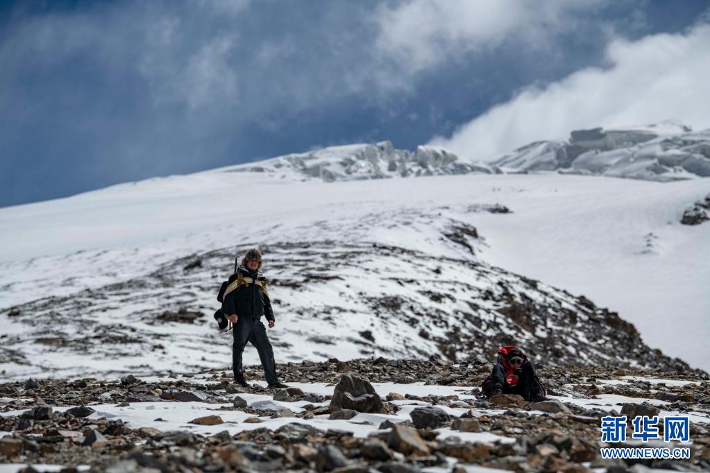 翻越一處險坡后,別克米爾扎·圖爾達力(左)和同伴庫爾班巴依·努爾麥麥提在休息(5月15日攝)。新華社記者 胡虎虎 攝