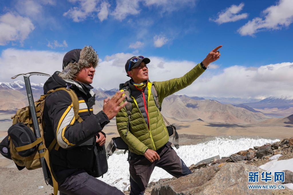 別克米爾扎·圖爾達力(左)和同伴庫爾班巴依·努爾麥麥提在討論登山前進線路(5月15日攝)。新華社記者 胡虎虎 攝