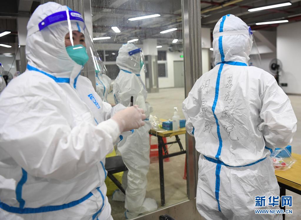 5月26日,在廣州荔灣體育館核酸檢測點,荔灣中心醫院的醫務人員在防護服上寫上個人信息。新華社記者 鄧華 攝