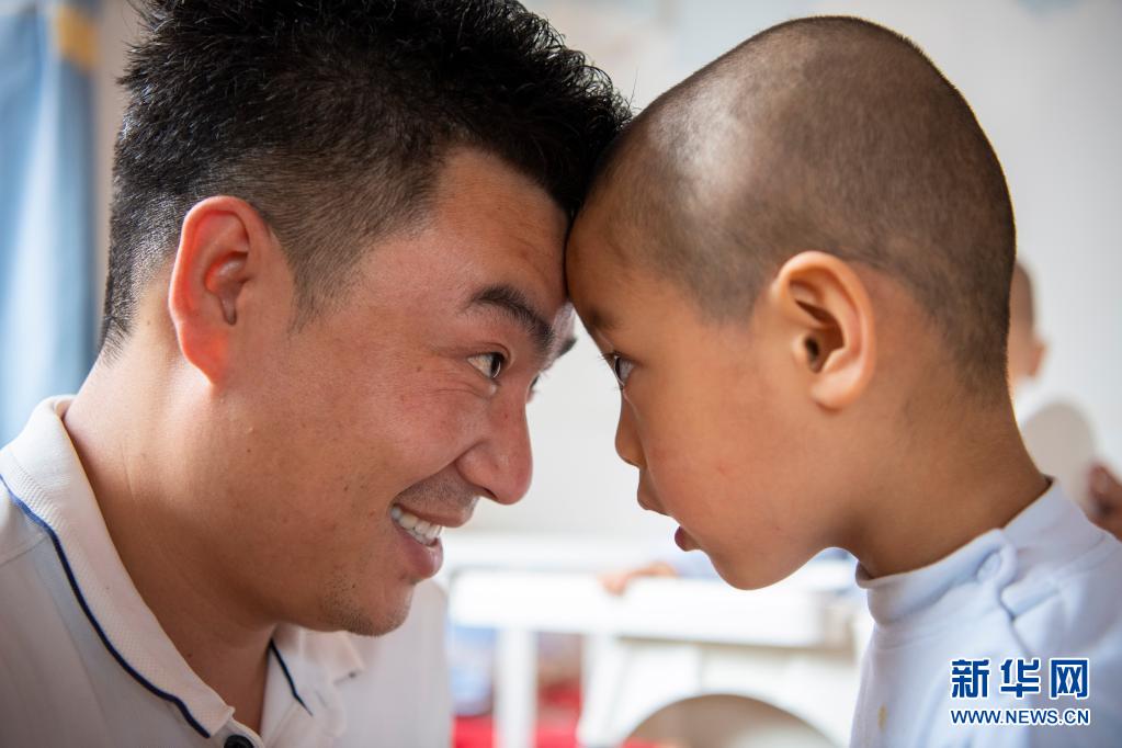 在太原市社會(兒童)福利院,黨龍祥在和一名小朋友交流(5月31日攝)。新華社記者 楊晨光 攝