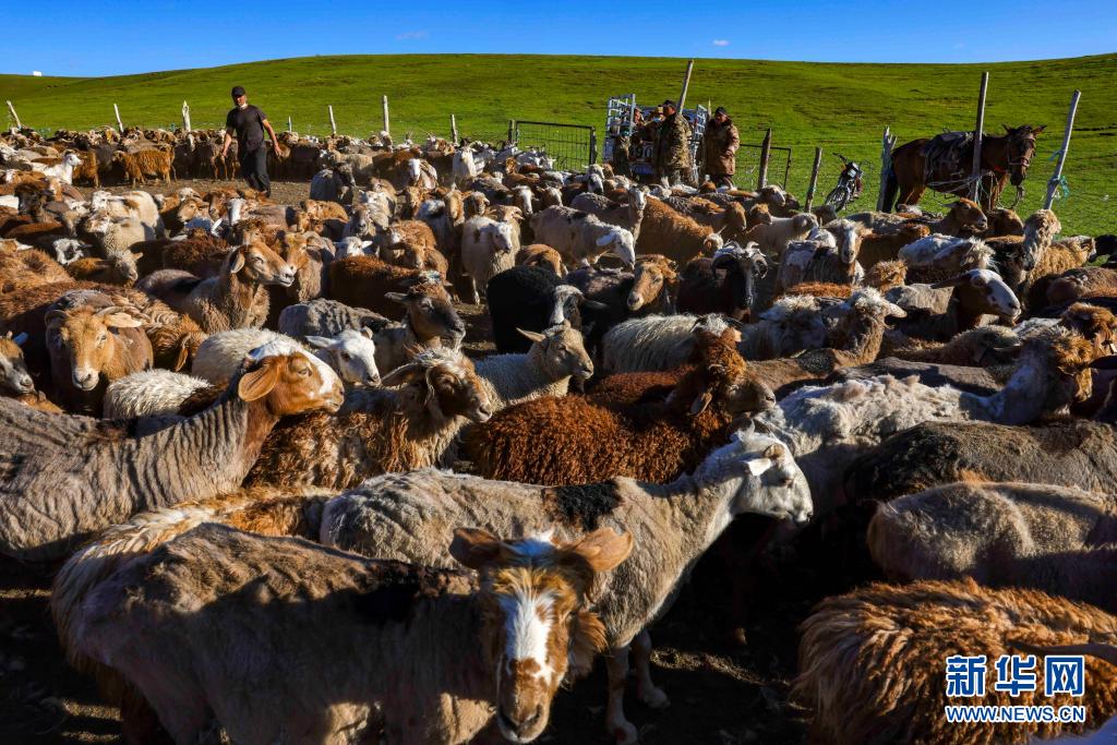 來自縣城的商人在裕民縣巴爾魯克山區(qū)夏牧場上收購小羊(6月14日攝)。