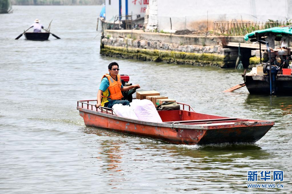 6月20日,在微山縣南陽鎮(zhèn),郵遞員王少朋駕駛郵船為柳溝村村民投遞郵件。