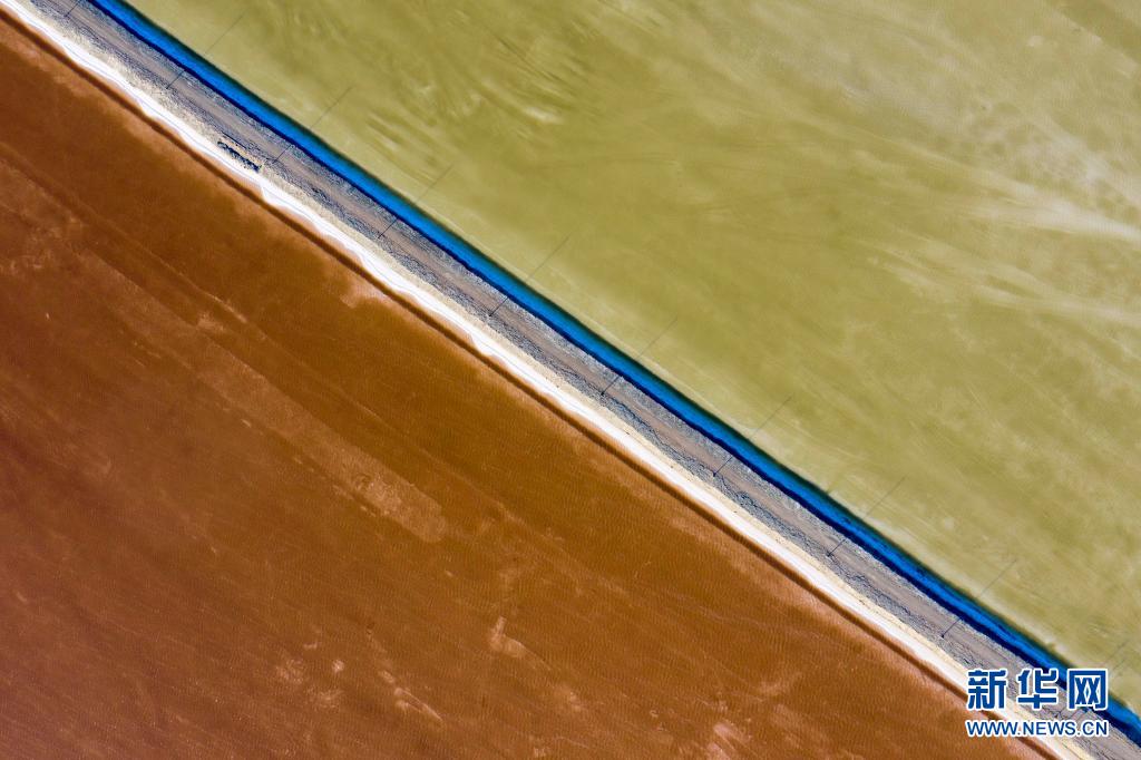 這是在新疆和布克賽爾蒙古自治縣瑪納斯鹽湖中鹽宏達(dá)鹽業(yè)生產(chǎn)基地拍攝的一處灘曬池(6月21日攝,無人機照片)。