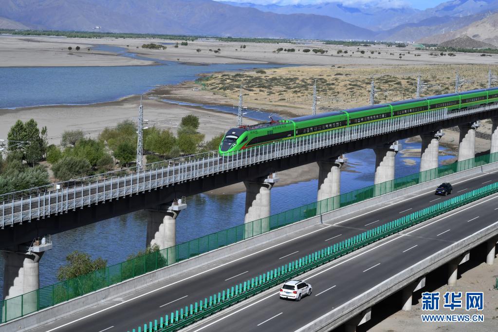 試運行的復興號列車行駛在雅魯藏布江畔(6月16日攝)。
