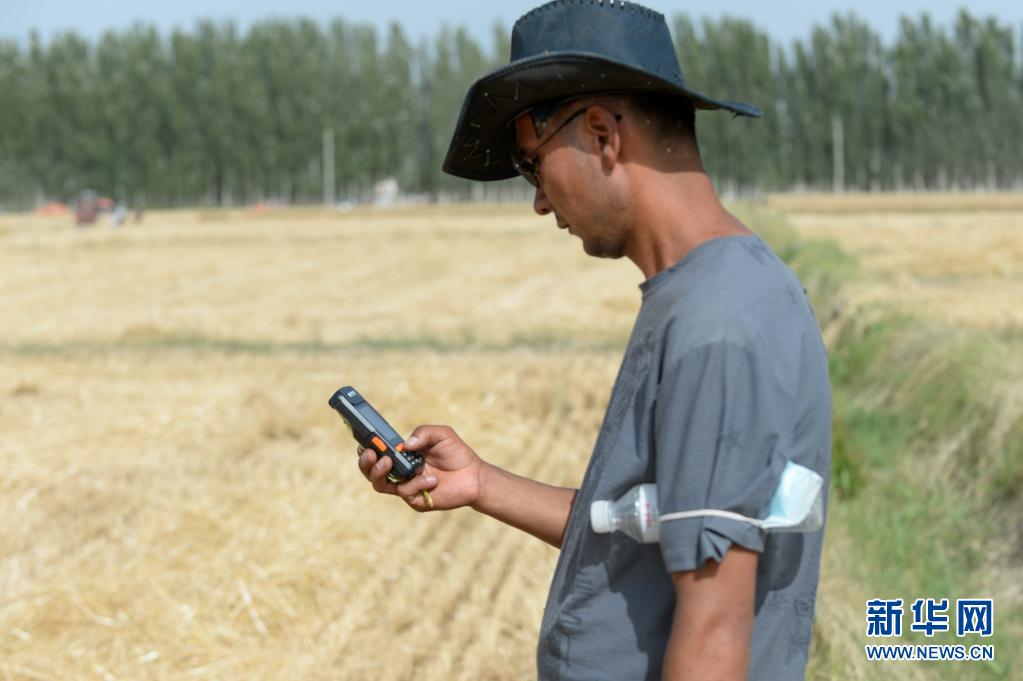 麥客阿地力·沙拉木在麥田間操作北斗導航控制器(6月19日攝)。新華社記者 高晗 攝