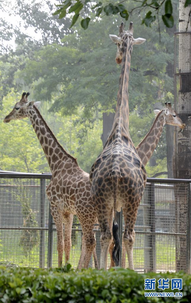 北京動物園的長頸鹿在樹下乘涼(6月28日攝)。
