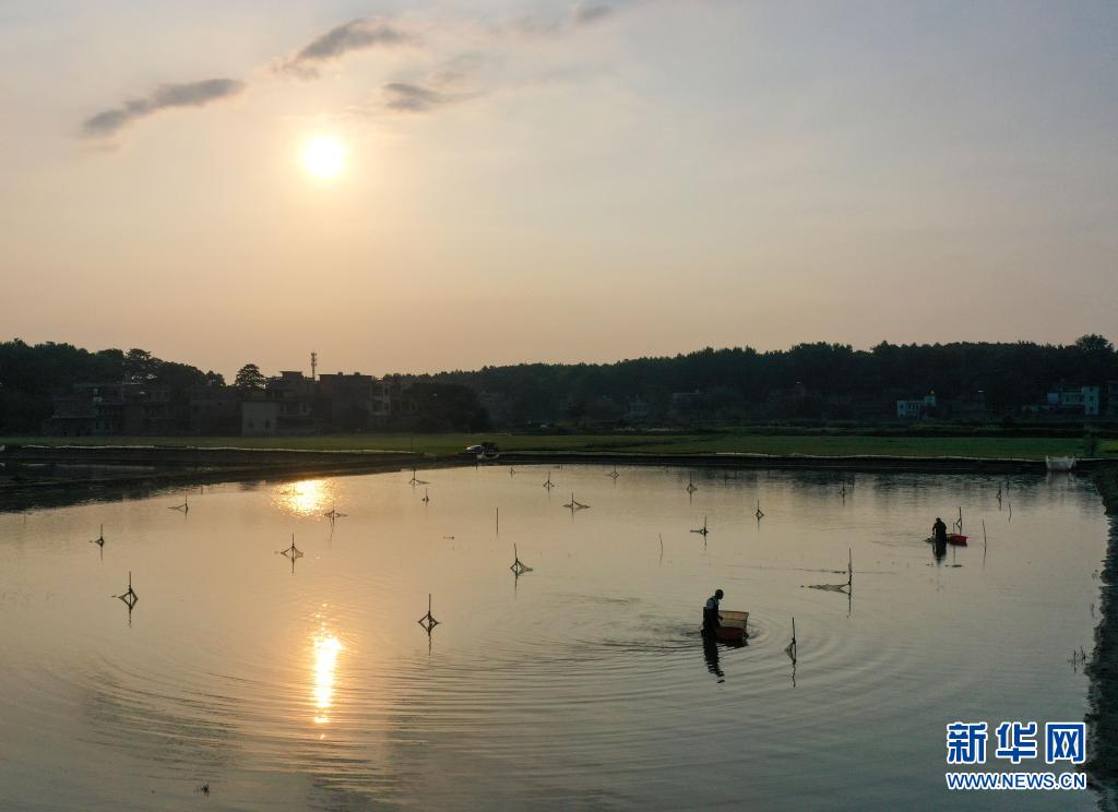 7月5日,在湖南省永州市道縣蚣壩鎮洲背村,村民在收獲小龍蝦(無人機照片)。