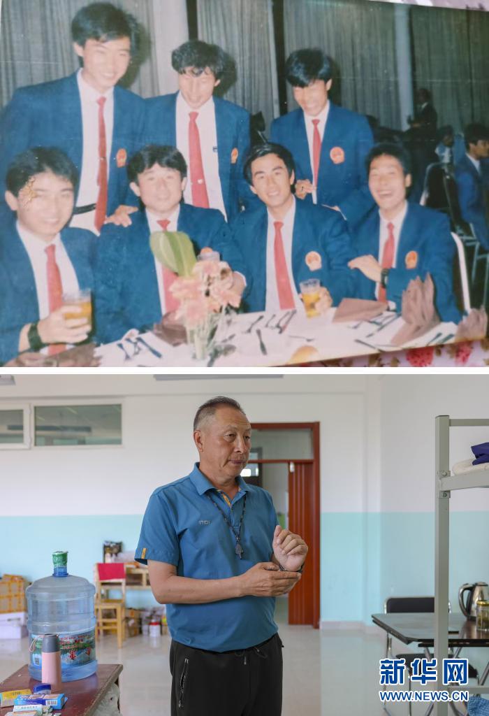 這是一張拼版照片:上圖為20世紀(jì)80年代杜寶柱(后排中)參加國際比賽時和隊員們的合影(受訪者供圖);下圖為杜寶柱教練在塔城市第二小學(xué)宿舍內(nèi)整理裝備,準(zhǔn)備出門帶隊訓(xùn)練(6月12日攝,新華社記者 胡虎虎 攝)。