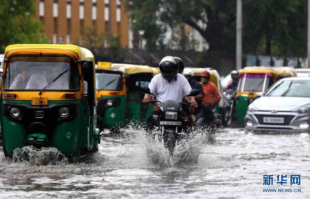 7月14日,車輛在印度新德里積水的街道上行進。