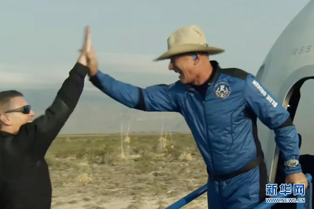 這張美國藍色起源公司7月20日發布的視頻截圖顯示,“新謝潑德”飛行器在美國得克薩斯州西部著陸后,該公司創始人杰夫·貝索斯(右)走出飛行器慶祝。