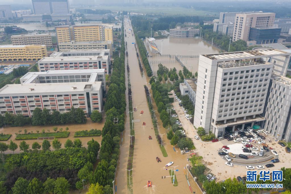 7月22日,在阜外華中心血管病醫院附近的錦繡路與鄭開大道交叉口,救援人員利用舟艇轉移人員(無人機照片)。
