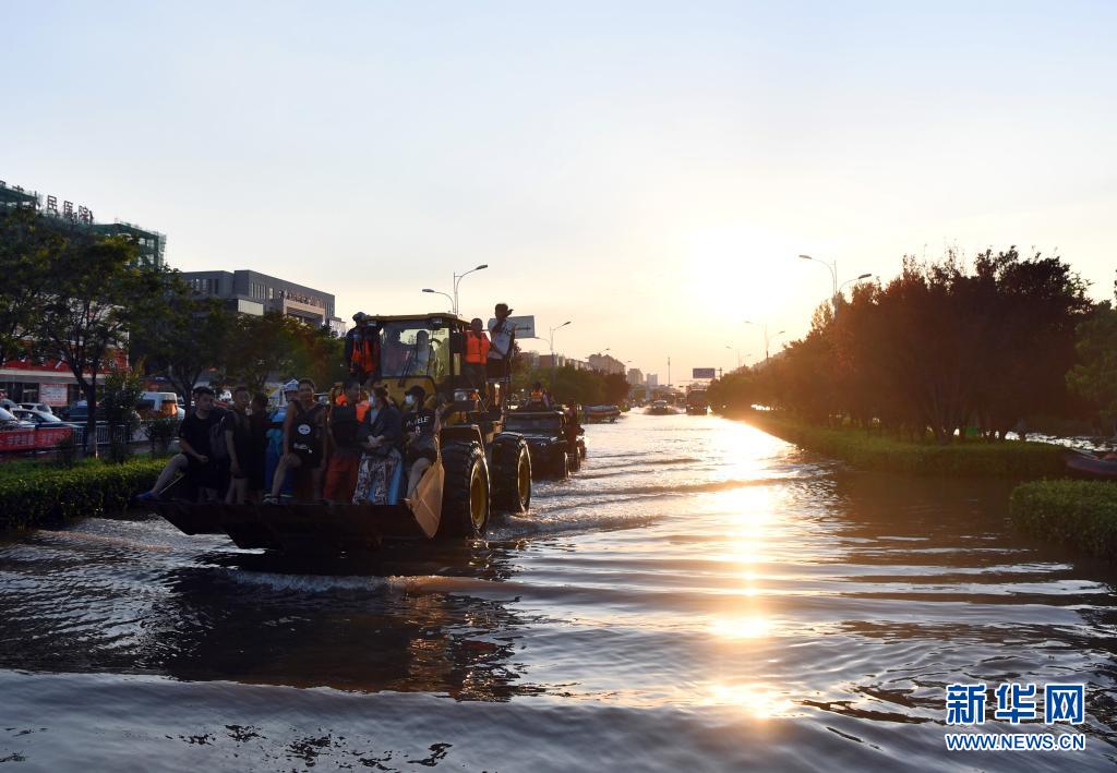 7月26日,在河南省衛輝市,受困群眾乘坐鏟車轉移。