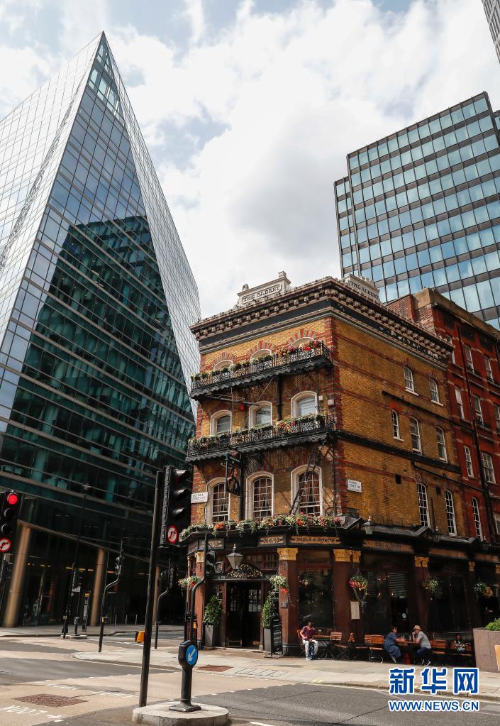 7月26日,人們坐在英國倫敦市中心一家酒吧的戶外餐飲區。