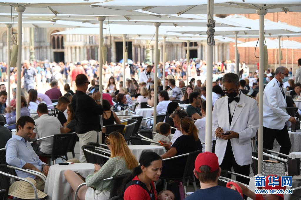 8月3日,游客在意大利威尼斯一處餐廳的戶外就餐區(qū)消費(fèi)。
