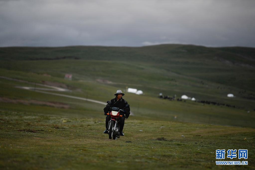 8月3日,在瑪沁縣當洛鄉貢龍村的夏季草場上,牧民騎著摩托車在查看牛羊。