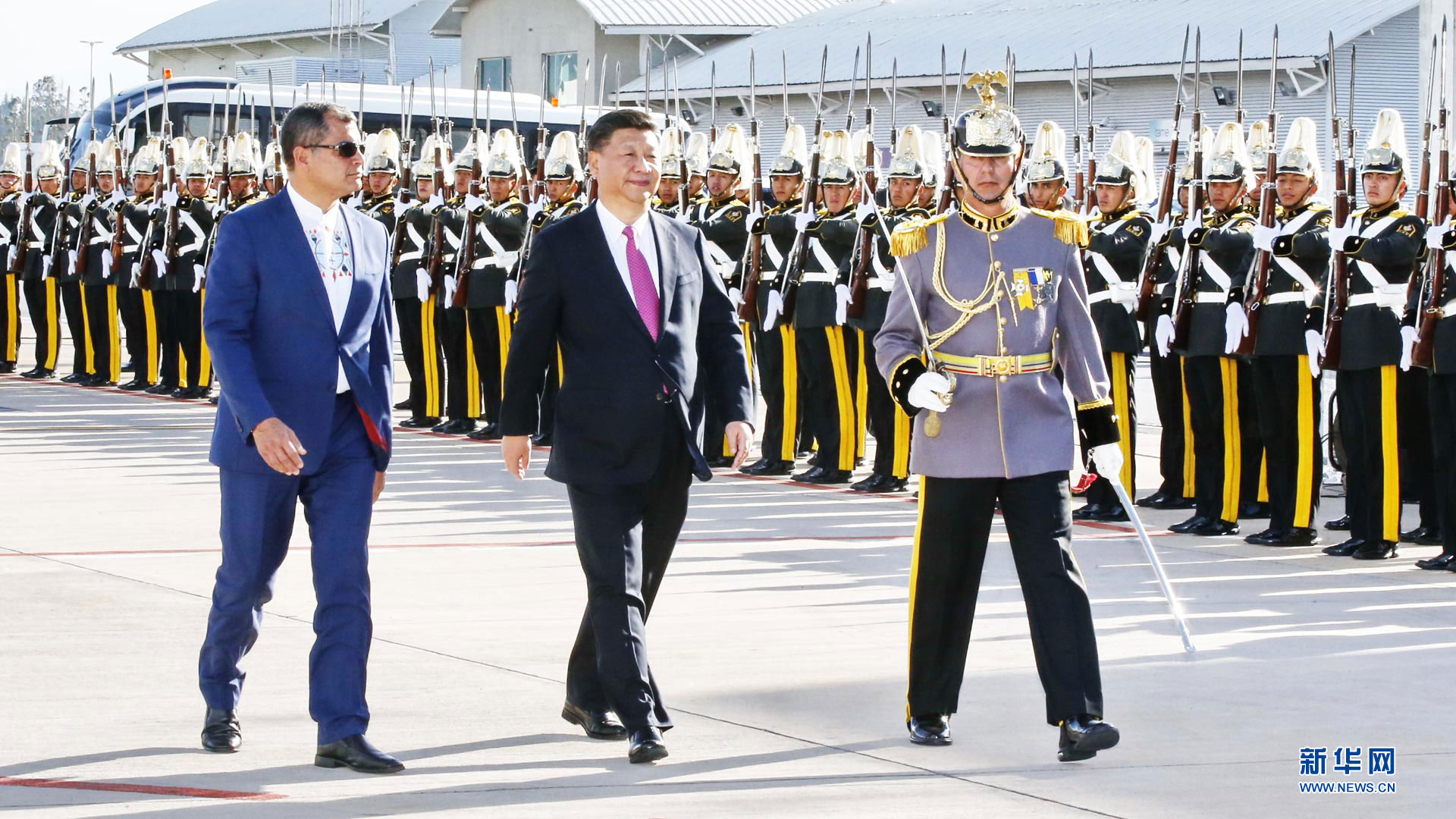 當地時間11月17日,國家主席習近平乘專機抵達基多,開始對厄瓜多爾共和國進行國事訪問。這是厄瓜多爾總統科雷亞在機場為習近平舉行隆重歡迎儀式。新華社記者 鞠鵬 攝2016-11-18