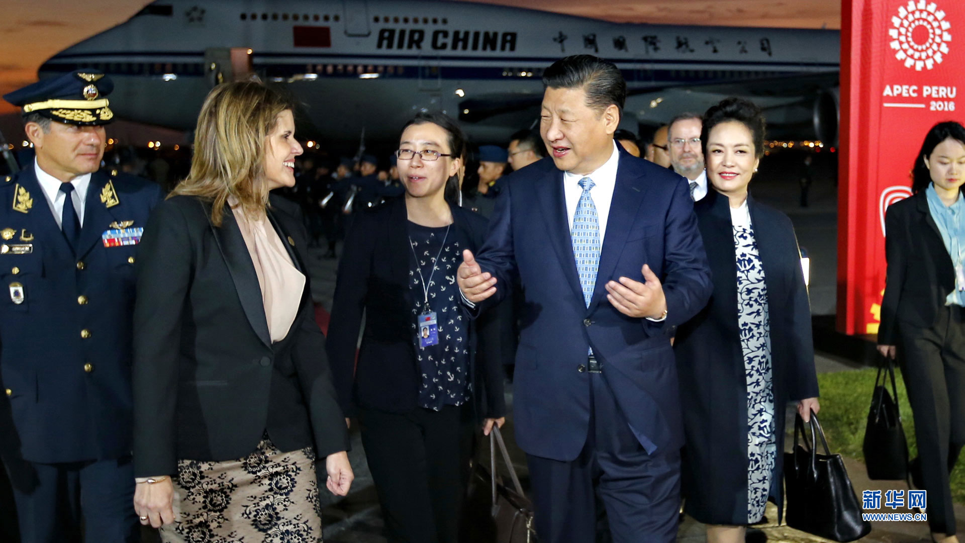 當地時間11月18日,國家主席習近平抵達利馬,出席亞太經合組織第二十四次領導人非正式會議并對秘魯共和國進行國事訪問。習近平和夫人彭麗媛受到秘魯副總統阿勞斯等熱情迎接。新華社記者 蘭紅光 攝2016-11-20