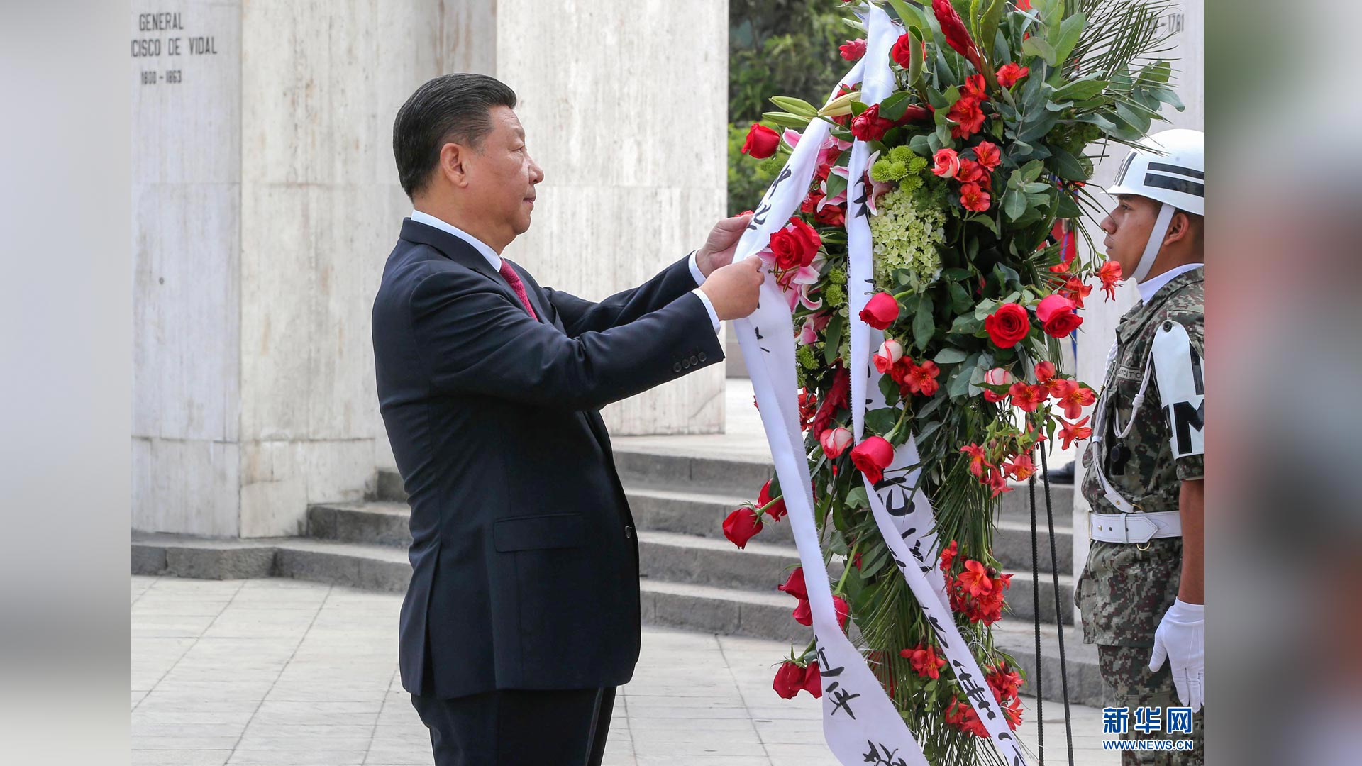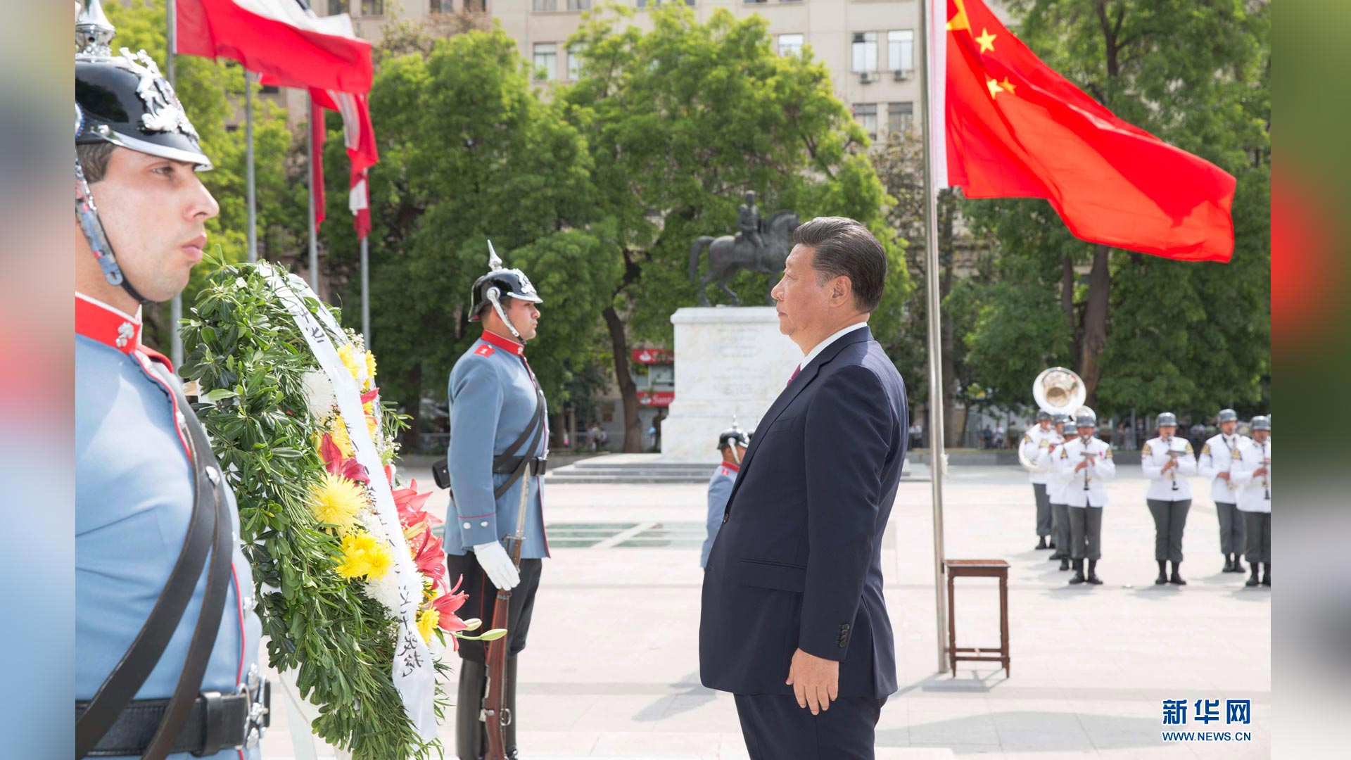11月22日,國家主席習近平在圣地亞哥向智利解放者奧希金斯紀念碑敬獻花圈。 新華社記者 黃敬文 攝2016-11-23