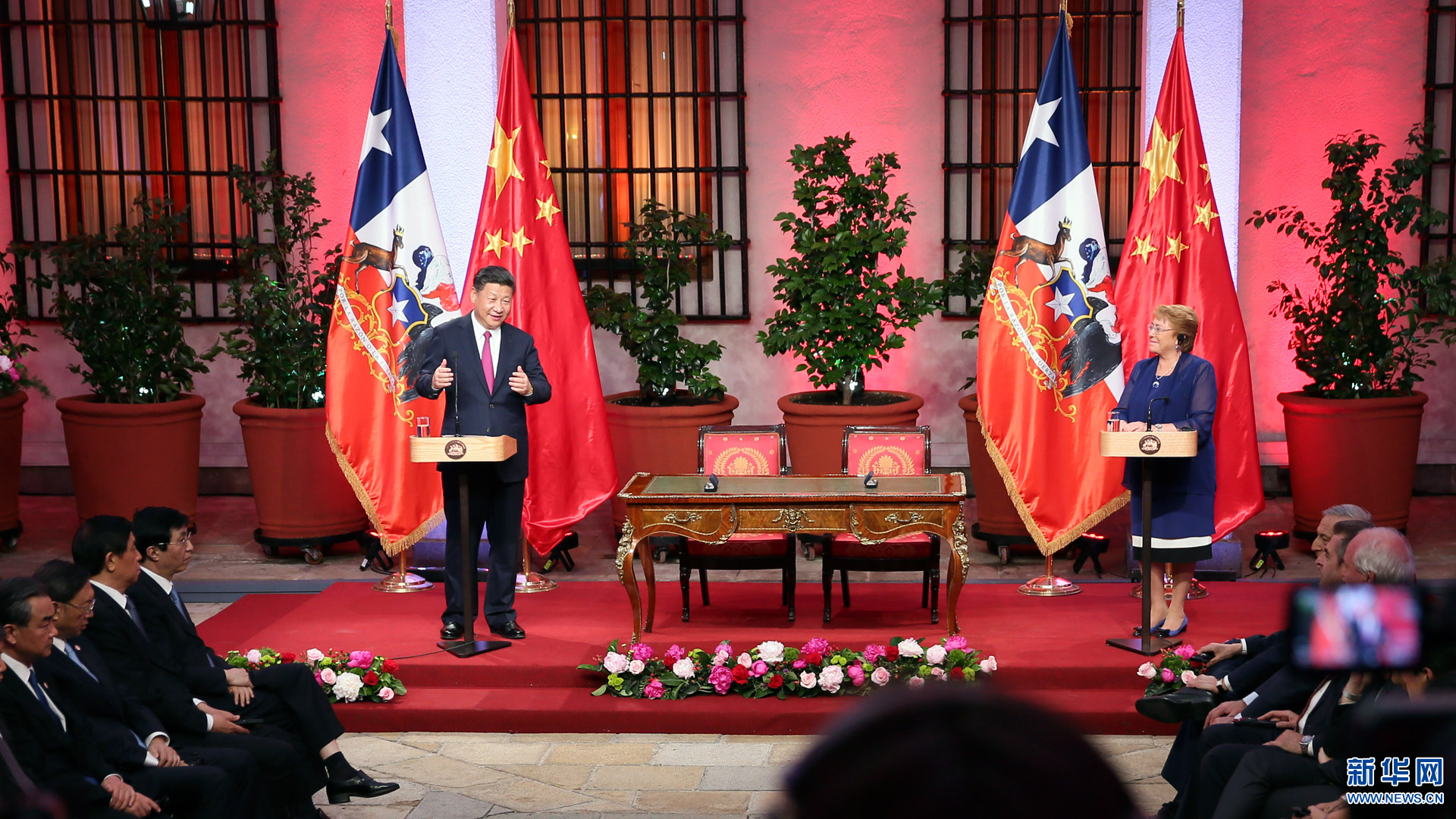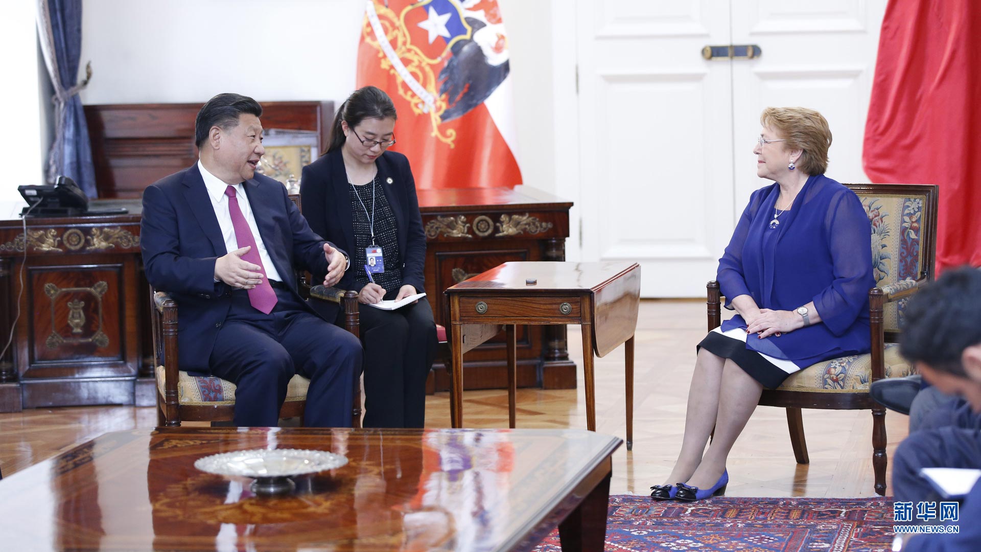 11月22日,國家主席習近平在圣地亞哥同智利總統巴切萊特舉行會談。 新華社記者 鞠鵬 攝2016-11-23